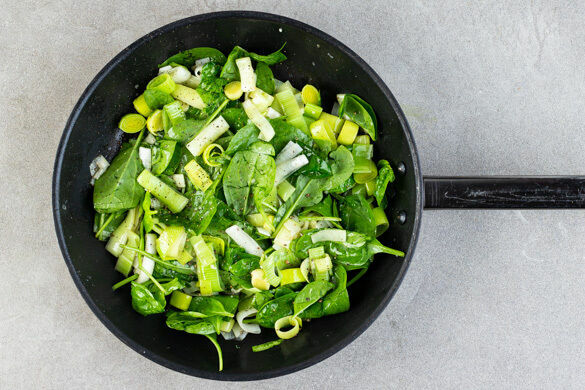 Den Lauch und den restlichen Knoblauch in der Pfanne mit 2EL Olivenöl und 1–2 kräftigen Prise Salz ca. 4Min. anbraten. Den Spinat unterheben und 1–2Min. zusammenfallen lassen. Die Pfanne vom Herd nehmen und das Gemüse mit Salz und Pfeffer abschmecken.