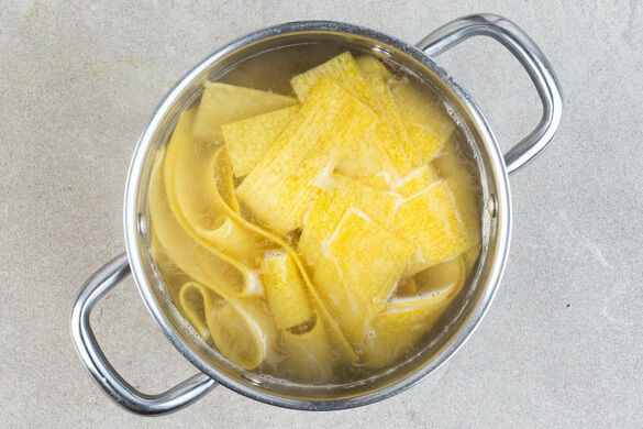 Die Lasagneblätter jeweils der Länge nach in 4 breite Streifen schneiden, in das kochende Wasser geben und in 7–8Min. bissfest kochen. In einem Sieb abtropfen lassen.
