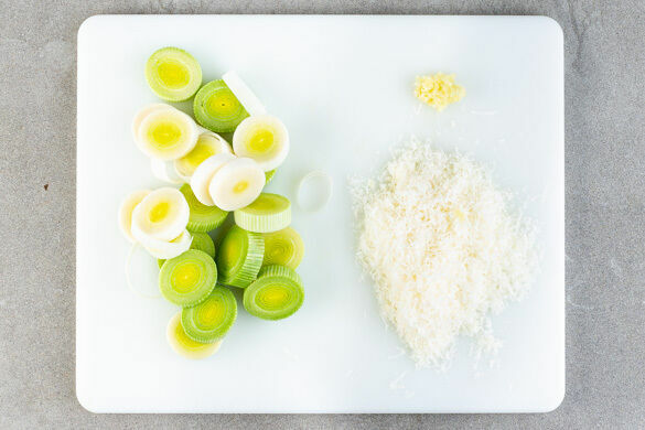 In einem großen Topf ausreichend gesalzenes Wasser für die Pasta zum Kochen bringen. Den Lauch in ca. 1cm breite Ringe schneiden. Den Knoblauch schälen und fein würfeln. Den Hartkäse fein reiben.