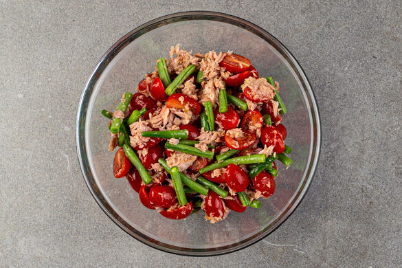 Den Backofen auf 200°C (180°C Umluft) vorheizen. Die Bohnen von den Enden befreien, dann dritteln. Die ½ der Tomaten halbieren. Den Thunfisch abgießen und mit den Bohnen, den halbierten Tomaten, 2EL Olivenöl sowie je 1 Prise Salz und Pfeffer vermengen.