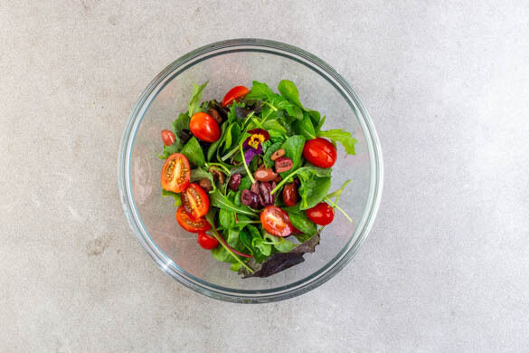 Die Oliven grob schneiden. Die restlichen Tomaten halbieren und mit dem Salat und den Oliven vermengen.