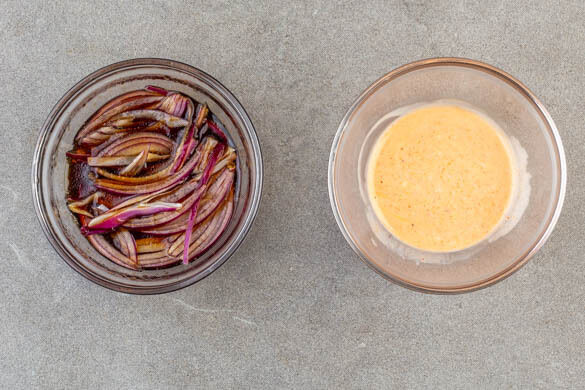 Die Srirachasauce mit 1½EL Mayonnaise, ½TL hellem Essig, dem geriebenen Knoblauch und je 1 Prise Salz und Pfeffer verrühren. Die Sojasauce mit dem Sesamöl, 4TL Honig, 1TL hellem Essig und 2EL heißem Wasser zu einem Dressing verrühren und ggf. mit mehr Honig abschmecken. Die Zwiebelstreifen mit dem Dressing vermengen.