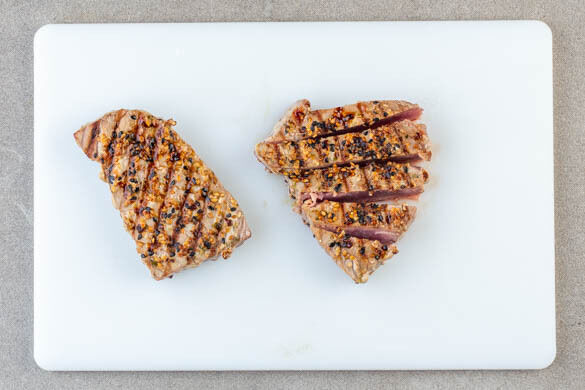Die Grillpfanne auf mittlerer bis starker Hitze erwärmen. Den Fisch von beiden Seiten mit insgesamt 1EL Pflanzenöl beträufeln. Sobald die Pfanne heiß ist, den Fisch 1–2Min. grillen, dann wenden und weitere 1–2Min. grillen, bis er leichte Röstspuren aufzeigt. Aus der Pfanne nehmen und 3–4Min. beiseitestellen.