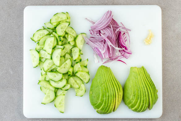 Die Gurken so schälen, dass ein Streifenmuster entsteht, dann halbieren und in dünne Scheiben schneiden. Die Zwiebel schälen, halbieren und in sehr feine Streifen schneiden. Den Knoblauch schälen und fein reiben. Die Avocados halbieren und den Kern entfernen. Das Fruchtfleisch mit einem Esslöffel lösen und in dünne Scheiben schneiden.
