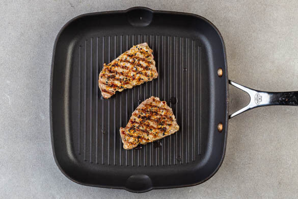 Die Grillpfanne auf mittlerer bis starker Hitze erwärmen. Den Fisch von beiden Seiten mit insgesamt 2EL Pflanzenöl beträufeln. Sobald die Pfanne heiß ist, den Fisch 1–2Min. grillen, dann wenden und weitere 1–2Min. grillen, bis er leichte Röstspuren aufzeigt. Aus der Pfanne nehmen und 3–4Min. beiseitestellen.