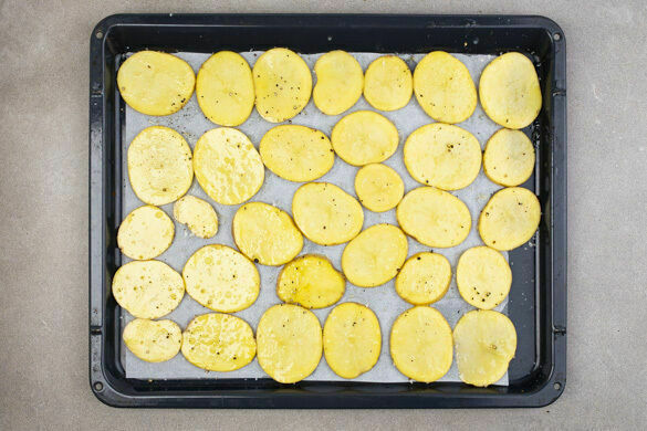 Den Backofen auf 210°C (190°C Umluft) vorheizen. Die Kartoffeln samt Schale in dünne Scheiben schneiden, mit 3EL Olivenöl sowie je ½TL Salz und Pfeffer vermengen und auf einem mit Backpapier ausgelegten Backblech verteilen. Im Ofen 25–30Min. backen, bis die Kartoffeln gar und goldbraun sind. Den Fisch kalt abspülen, trocken tupfen und evtl. vorhandene Gräten und Schuppen entfernen.