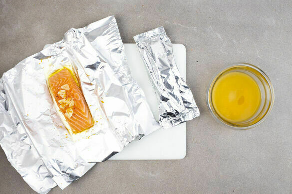 Die Orangenschale abreiben, dann die Orange halbieren und auspressen. Den Knoblauch schälen und in feine Scheibchen schneiden. Den Fisch jeweils auf ein Stück Alufolie legen. Mit insgesamt 2TL Olivenöl beträufeln und mit je 1 Prise Salz und Pfeffer würzen. Die Orangenschale und den Knoblauch über den Fisch streuen und die Alufolie zu luftdichten Paketen falten.