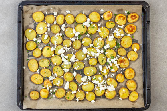 Die Oreganoblättchen abzupfen und fein schneiden. Den Feta mit den Fingern über den gebackenen Kartoffeln zerkrümeln und mit dem Oregano vermengen.