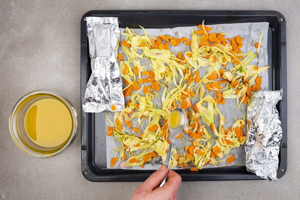 Den Fenchel der Länge nach vierteln, dann in dünne Streifen schneiden, dabei den harten Strunk entfernen. Die Karotten ggf. schälen, längs halbieren und schräg in dünne Scheiben schneiden. Das Gemüse mit 1EL Olivenöl und je 1 kräftigen Prise Salz und Pfeffer auf einem zweiten mit Backpapier ausgelegten Backblech vermengen und in 15–20Min. im Ofen goldbraun backen.