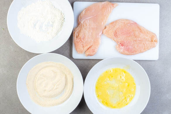 Das Fleisch trocken tupfen, horizontal in 2 gleich große Stücke schneiden und zwischen Frischhaltefolie mit einem Fleischklopfer oder einer schweren Pfanne ca. 0,5cm dünn klopfen. In einem tiefen Teller 2EL Mehl mit je 1 kräftigen Prise Salz und Pfeffer vermengen. In einem weiteren Teller 1 Ei verquirlen. Die Semmelbrösel in einem dritten Teller mit 1 Prise Salz vermengen.