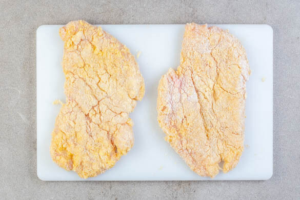 Eine mittlere Pfanne ca. 1cm hoch mit Pflanzenöl befüllen und stark erhitzen. Das Fleisch der Reihe nach im Mehl, im Ei und in den Semmelbröseln wenden. Diesen Vorgang wiederholen.