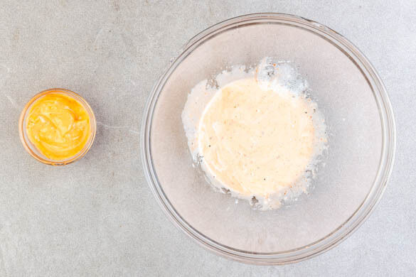Für den Coleslaw in einer großen Schüssel 1EL Mayonnaise mit dem Sesamöl, der ½ der Sriracha-Sauce, ½EL hellem Essig und je 1 Prise Salz und Pfeffer zu einem Dressing verrühren. In einer kleinen Schüssel für die Hotdogs die restliche Sriracha-Sauce mit 1EL Mayonnaise verrühren.
