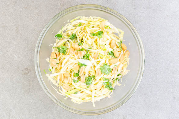 Den Weißkohl in einem Sieb abtropfen lassen und überschüssige Flüssigkeit ausdrücken. Dann mit den Lauchzwiebeln, ca. ¾ des Korianders, ca. ¾ der Erdnüsse und dem Dressing vermengen. Den restlichen Koriander und die restlichen Erdnüsse für die Garnitur aufbewahren.