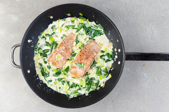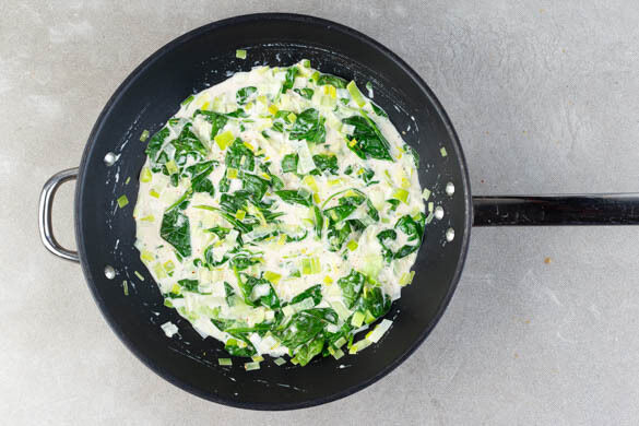 Eine große Pfanne bei mittlerer Hitze ohne Zugabe von Fett erwärmen. Den Lauch, den Spinat, die Kokosmilch und 50ml Wasser in die warme Pfanne geben, mit 1 kräftigen Prise Salz würzen und ca. 4Min. köcheln lassen.