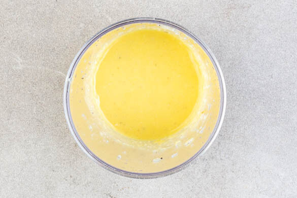 1EL Mayonnaise, 1EL Olivenöl, ½EL Essig, 1TL Senf, die ½ des Hartkäses, den übrigen Knoblauch und je 1 Prise Salz und Pfeffer in einem hohen Gefäß zu einem glatten Dressing pürieren.