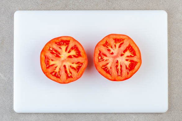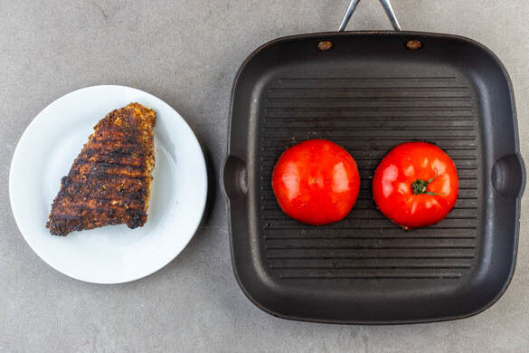 Das Fleisch in einer heißen Grillpfanne oder auf dem Grill bei starker Hitze auf jeder Seite 4–5Min. braten, bis es durch ist. Auf einem Teller abgedeckt warm halten. Die Tomatenhälften mit der Schnittfläche nach unten ebenfalls bei starker Hitze ca. 4Min. grillen.
