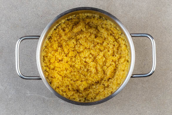 Den Bulgur in die kochende Brühe rühren und abgedeckt bei niedriger Hitze 5–7Min. sanft köcheln lassen, bis die Flüssigkeit Wasser aufgesaugt und der Bulgur gar ist. Noch ca. 5Min. ohne Hitzezufuhr ziehen lassen.