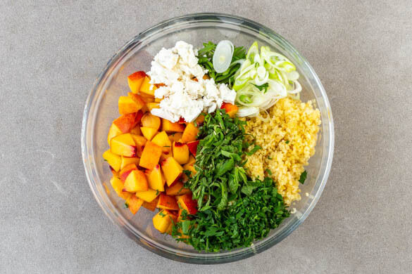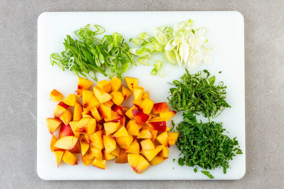In der Zwischenzeit die Lauchzwiebeln schräg in feine Ringe schneiden. Die Nektarinen vierteln, entkernen und in kleine Würfel schneiden. Die Minzeblätter abzupfen und mit der Petersilie samt Stängeln fein schneiden.