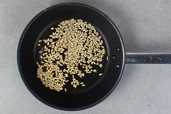 Die Sonnenblumenkerne__ in einer mittelgroßen Pfanne ohne Zugabe von Fett bei mittlerer Hitze 2–4Min. anrösten, bis sie knistern und goldbraun sind. Zum Abkühlen aus der Pfanne nehmen.