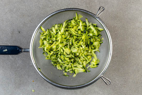 Den Backofen auf 240°C (220°C Umluft) vorheizen. Die Zucchini grob raspeln, in einem Sieb mit etwas Salz vermischen und ziehen lassen.