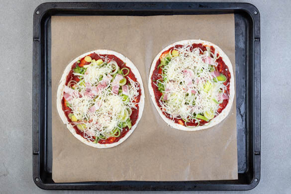 Für die ersten 4 Pizzen zwei Backbleche mit Alufolie auslegen und jeweils 2 Tortillas darauflegen. Die Tortillas gleichmäßig bis zum Rand mit der ½ der Pizzasauce bestreichen und mit der ½ der Zucchini, der ½ des Lauchs und der ½ des Bacons belegen. Die Pizzen mit der ½ des Käses bestreuen und mit etwas Salz würzen.