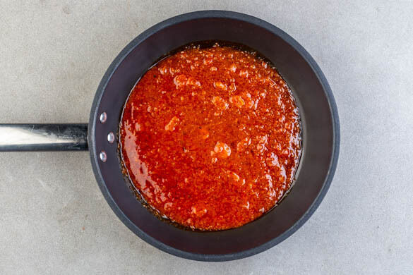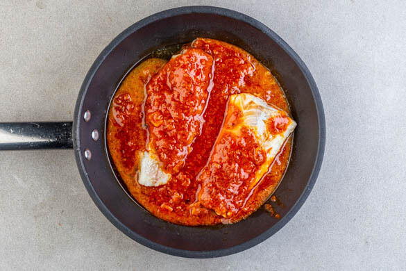1 Zitronenhälfte auspressen. 2EL Butter in einer mittelgroßen Pfanne bei mittlerer Hitze ca. 5Min. schmelzen, bis sie zu bräunen beginnt. Den Knoblauch schälen und in feine Scheibchen schneiden, mit der Harissa in die Pfanne geben und ca. 1Min. erhitzen. Mit 2EL Zitronensaft sowie Salz und Pfeffer abschmecken. Die Harissa aus der Pfanne nehmen und die Pfanne auswischen.