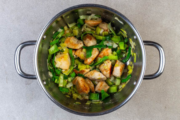 Den Lauch mit 1 kräftigen Prise Salz dazugeben und bei mittlerer Hitze ca. 3Min. braten, dabei ab und an umrühren.