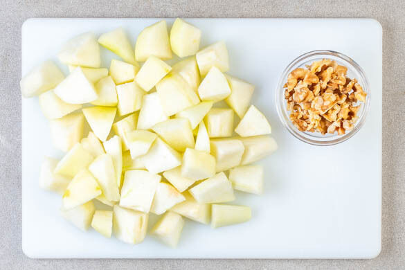 Inzwischen in einem Wasserkocher 400ml Wasser zum Kochen bringen. Die Birnen schälen, entkernen und in 2–3cm große Würfel schneiden. Die Walnüsse grob hacken.