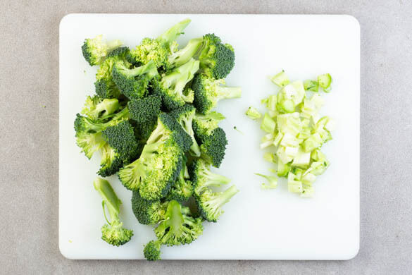1EL Butter auf Zimmertemperatur aufwärmen lassen. Den Brokkoli in Röschen zerteilen, den oberen Teil des Strunks in ca. 0,5cm große Würfel schneiden.