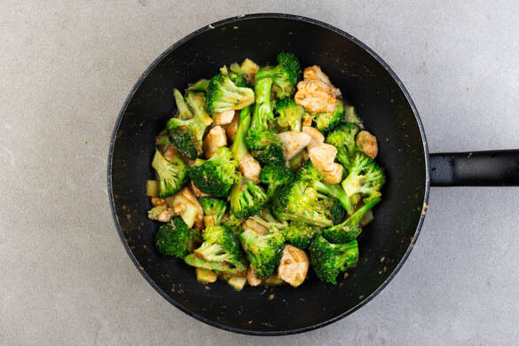 Auf mittlere Hitze reduzieren, den Brokkoli und die Knoblauch-Ingwer-Paste zugeben und weitere 5–6Min. braten.
