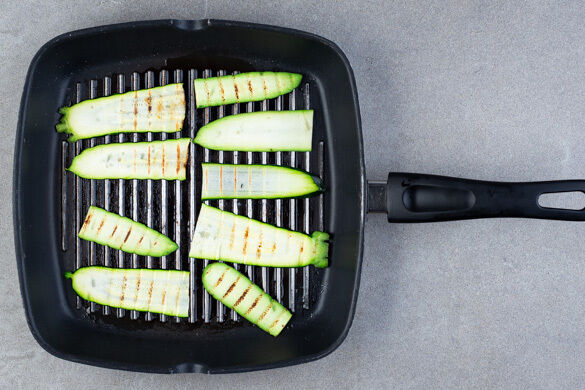 In einem mittelgroßen Topf 600ml leicht gesalzenes Wasser zum Kochen bringen. Die Zucchini quer halbieren und längs in hauchdünne Streifen schneiden. Die Zucchinistreifen mit insgesamt 2EL Olivenöl bestreichen und mit je 1 Prise Salz und Pfeffer würzen. In einer Grillpfanne oder einer normalen Pfanne bei starker Hitze ohne Zugabe von Fett auf jeder Seite 1–2Min. goldbraun anbraten.