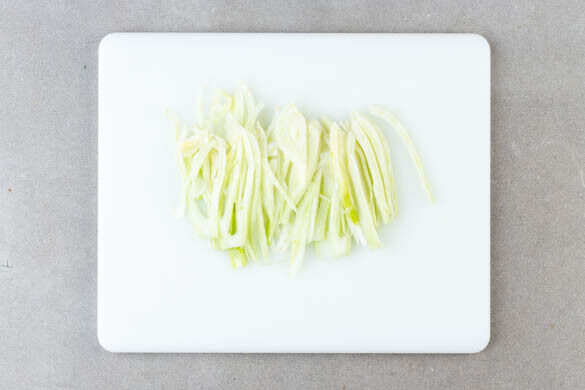 Den Fenchel jeweils längs halbieren und in hauchdünne Streifen schneiden, dabei den Strunk und die harten Stängel entfernen.
