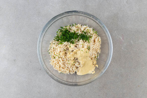 Den Reis in einem Sieb mit kaltem Wasser abschrecken und abtropfen lassen. Den Dill grob schneiden, dann ¾ des Dills mit dem Reis und dem Dressing vermengen.