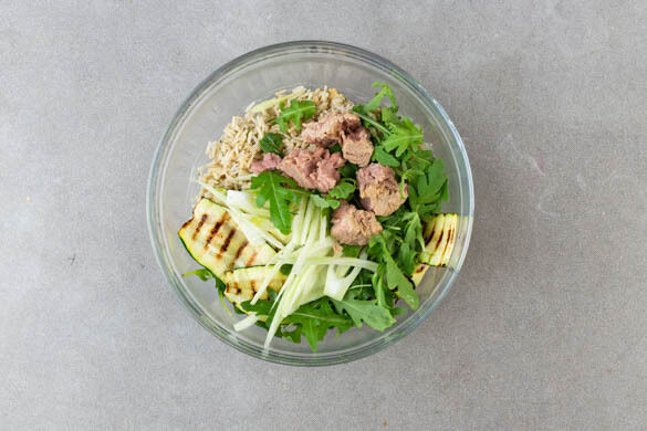 Schnell und einfach soll es sein? Und knackig-frisch wäre auch nicht schlecht? Na, dann haben wir etwas für dich: unsere leckere Thunfisch-Bowl, die nicht nur dem Auge, sondern auch dem Gaumen schmeckt. Naturreis mit Dill und köstlichem Tahinidressing bildet die schmackhafte Basis für diese Leckerei. Darauf tummeln sich gegrillte Zucchini, knackiger Fenchel, pfeffriger Rucola und natürlich: zarter Thunfisch. Lecker!