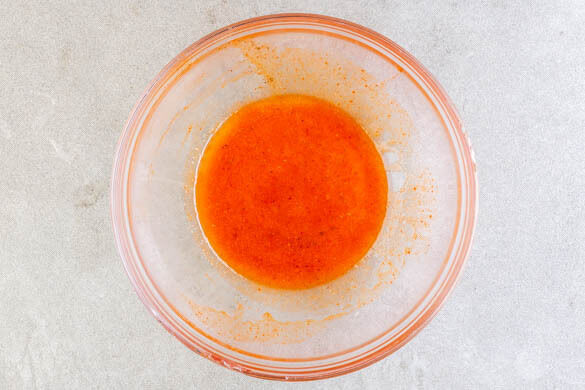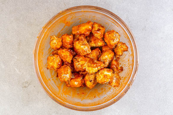 Währenddessen in einem kleinen Topf oder der Mikrowelle 2EL Butter schmelzen. In einer großen Schüssel die Sriracha-Sauce mit der geschmolzenen Butter, 2TL Essig, 1TL Honig, 2TL lauwarmem Wasser und je 1 kräftigen Prise Salz und Pfeffer zu einer Sauce verrühren. Beiseitestellen, bis der Tofu fertig gebacken ist.