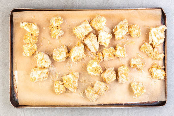 Den Tofu mit den Semmelbröseln vermengen, sodass alles gleichmäßig bedeckt ist. Auf ein mit Backpapier ausgelegtes Backblech geben, vorsichtig mit 4EL Pflanzenöl vermengen und in 20–25Min. im Ofen goldbraun backen. Den Tofu nach der Hälfte der Backzeit wenden, damit er von allen Seiten knusprig wird.