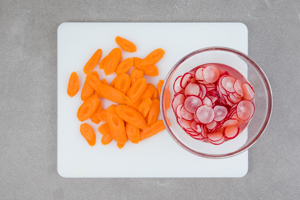 Die Radieschen in dünne Scheiben schneiden. In einem weiteren kleinen Topf 2EL Wasser mit 2EL hellem Essig, 1TL Zucker und 1 Prise Salz verrühren und bei starker Hitze einmal aufkochen lassen, dann den Sud über die Radieschen gießen. Gut verrühren und ziehen lassen. Die Karotte ggf. schälen und schräg in dünne Scheiben schneiden.