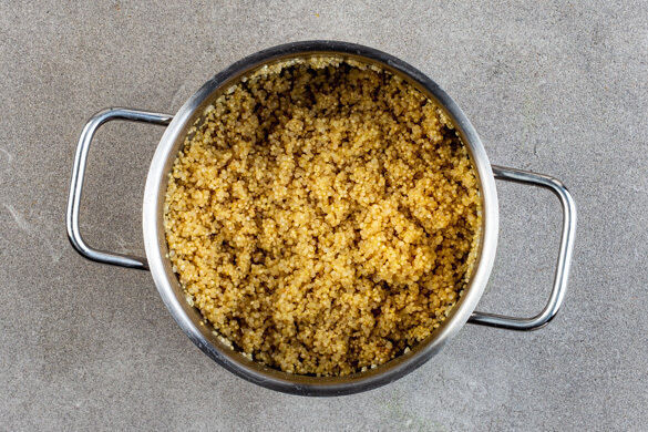 Die Quinoa in einem feinmaschigen Sieb mit warmem Wasser abspülen, in das kochende Wasser geben und 18–20Min. abgedeckt bei niedriger bis mittlerer Hitze sanft köcheln lassen. Vom Herd nehmen und bis zum Servieren warm halten.