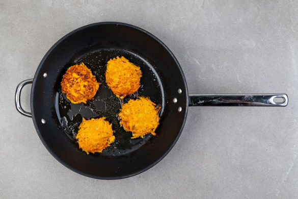 2EL Pflanzenöl in einer großen, beschichteten Pfanne bei mittlerer Hitze erwärmen. Für jede Rösti ca. 1EL Teig zu einer Kugel formen und in der Pfanne ca. 1cm flach drücken. Von jeder Seite 3–4Min. ausbacken, bis die Rösti gar und goldbraun sind. So fortfahren, bis die Röstimasse verbraucht ist. Tipp: Bei Bedarf mehr Pflanzenöl zugeben.
