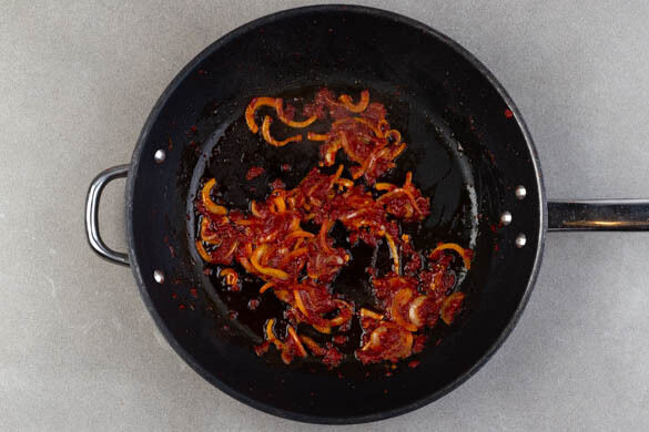 In einem mittelgroßen Topf 450ml leicht gesalzenes Wasser für den Bulgur zum Kochen bringen. Die Zwiebel schälen, halbieren und in feine Streifen schneiden. Die Zwiebeln und das Tomatenmark in einer mittelgroßen Pfanne mit 2EL Olivenöl bei mittlerer Hitze 4–7Min. anbraten, dabei regelmäßig umrühren.