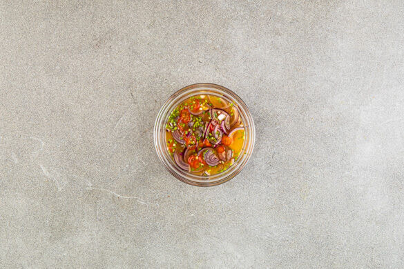 Die Zwiebel schälen, halbieren und eine Hälfte in feine Streifen schneiden. Die andere Hälfte wird nicht benötigt. Die Korianderblätter abzupfen, die Stängel fein schneiden. Die ½ der Peperoni in feine Würfel schneiden. Den Orangensaft auspressen, mit den Zwiebeln, der Peperoni und den Stängeln mischen und mit 1 Prise Salz und 1 Prise Zucker würzen.