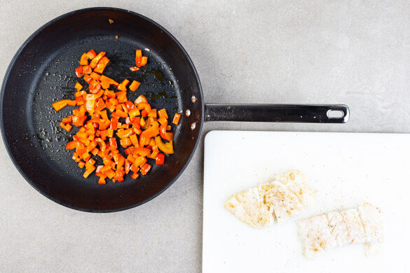 Den Fisch in einer großen Pfanne mit 4EL Olivenöl bei mittlerer bis starker Hitze ca. 3Min. anbraten. Mit 1 kräftigen Prise Salz und der Gewürzmischung würzen. Den Fisch wenden und erneut ca. 3Min. braten, bis er gar ist, dann auf einem Teller beiseitestellen. Die Paprika in derselben Pfanne bei mittlerer bis starker Hitze ca. 2Min. braten und mit 1 Prise Salz würzen.
