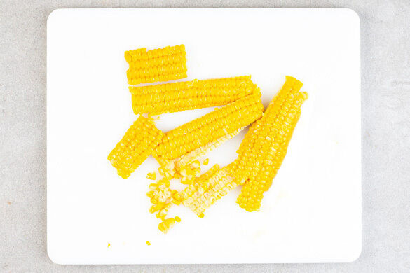 In einem mittelgroßen Topf ausreichend gesalzenes Wasser für den Mais und die Süßkartoffel zum Kochen bringen. Die Hüllblätter und Fäden entfernen, dann den Mais in das warme Wasser geben, auch wenn es noch nicht kocht. Den Mais in 18–20Min. gar kochen.