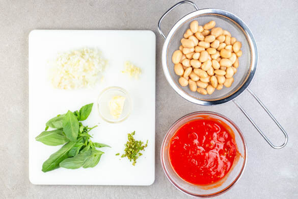 Den Backofen mit Grillfunktion auf 200°C vorheizen. 4EL Butter weich werden lassen. Die Zwiebeln und den Knoblauch schälen und fein würfeln. Die Tomaten in eine Schüssel geben und mit den Händen zerdrücken, sodass eine stückige Sauce entsteht. Die Bohnen abspülen und abtropfen lassen. Die Basilikumblätter abzupfen und die Stängel fein schneiden.