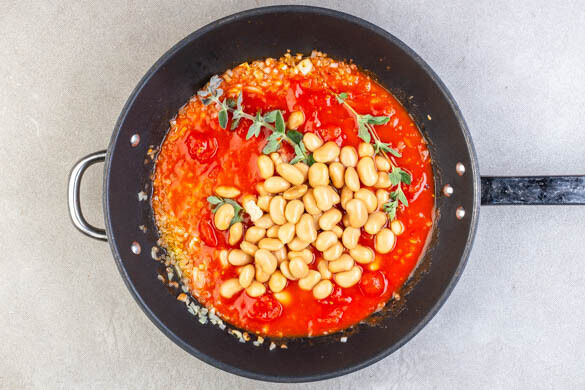 Die Zwiebeln und die ½ des Knoblauchs in einer großen ofenfesten Pfanne mit 4EL Olivenöl bei mittlerer Hitze ca. 2Min. anbraten. Dann die Tomaten und die Oreganozweige hinzugeben und abgedeckt zum Kochen bringen. Die Bohnen, 100ml Wasser und je 1 kräftige Prise Salz und Pfeffer unterrühren und ca. 10Min. abgedeckt köcheln lassen, bis die Sauce eindickt.