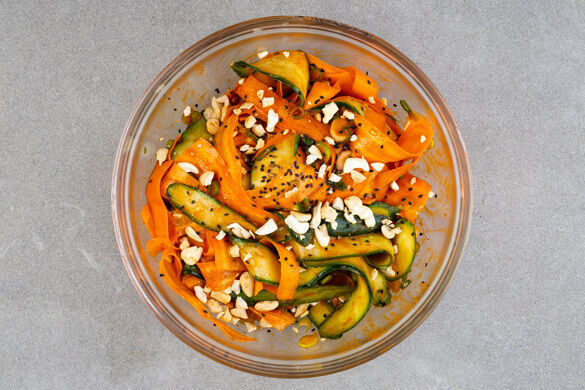 Die Karotten ggf. schälen und mit einem Sparschäler in feine Streifen schneiden. Die Gurke ebenfalls mit dem Sparschäler in feine Streifen schneiden, dabei den weichen Kern aussparen. Die Lauchzwiebeln in dünne Ringe schneiden und zuerst mit den Gemüsestreifen und dem Dressing, dann mit den Cashews und dem Sesam zu einem Salat vermengen.