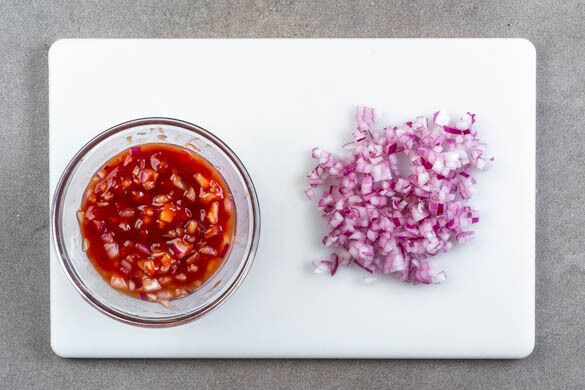 Die Zwiebel schälen, halbieren und in möglichst kleine Würfel schneiden. Die ½ der Zwiebelwürfel mit 4EL Ketchup und 1EL Wasser verrühren und beiseitestellen.