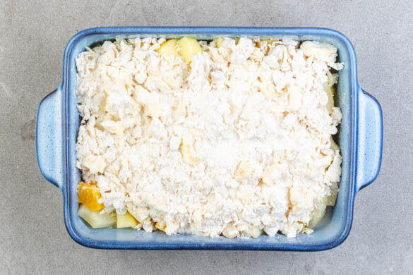 Das Obst in einer ausreichend großen Auflaufform verteilen und gleichmäßig mit den Streuseln bedecken. Nach Belieben mit etwas Zucker bestreuen.