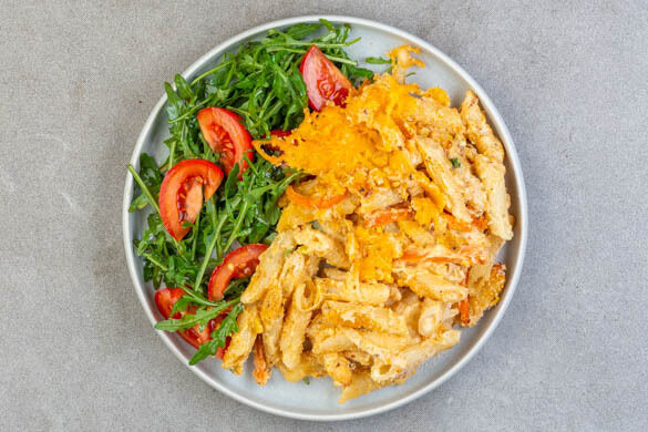 Den Pasta-Auflauf mit dem Tomaten-Rucola-Salat anrichten und servieren.
