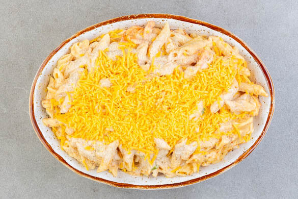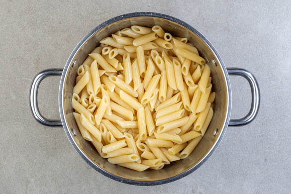 Den Backofen auf 200°C (180°C Umluft) vorheizen. In einem großen Topf ausreichend gesalzenes Wasser für die Pasta zum Kochen bringen. Die Pasta in das kochende Wasser geben und 4–6Min. kochen, bis sie fast gar, aber noch sehr fest ist. In ein Sieb abgießen und abtropfen lassen, dann zurück in den Topf geben.